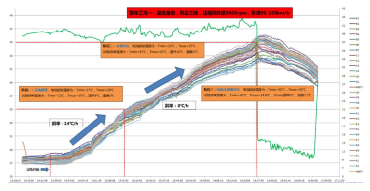 高温环境使得动力电池电芯温度骤然升高,虽然不影响放电效率,但全负载使用,电芯产生的热量不能快速排出,导致电池电芯活性激增,容易出现燃烧或自燃事故。