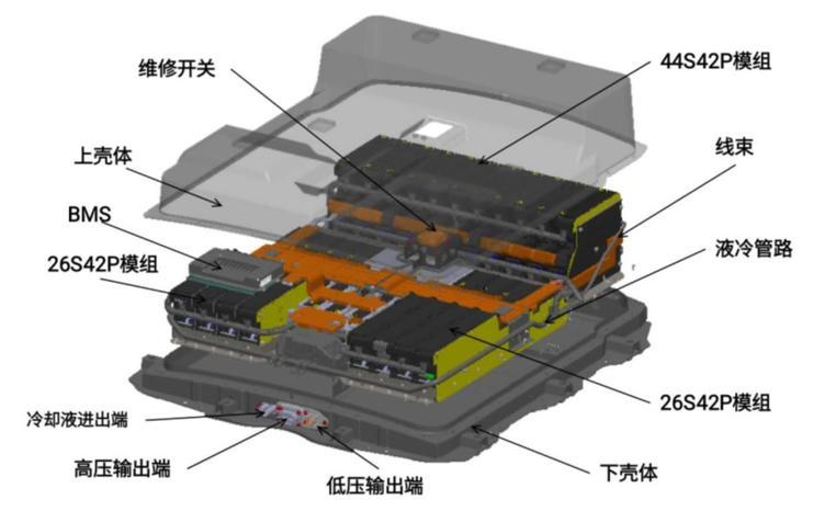 动力电池内部管路主要由冷却偏管和多通阀体构成,布设在动力舱的管路串联了电子水泵、补水壶、电池冷却器和水加热器。