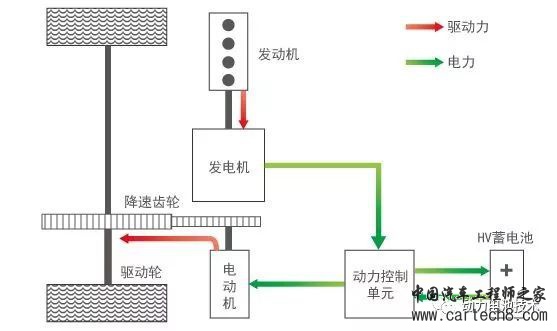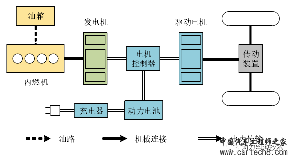发动机和发电机之间直接相连,两者协同工作,组成辅助动力装置(Auxiliary Po以er Unit),发动机做工并不能直接作用于驱动力上,而是经由发动机将汽油中的内能变为热能再进一步成为动能,作用于发电机,发电机将动能变成电量,储存于储能设备也就是车载动力电池组当中,接着利用车载动力电池组中的电能使电动机做工带动驱动轮工作,从而完成一整套动力系统的工作流程。串联式混合动为汽车只有一条能量传到路线,在串联式混合动力系统中,电动机代替了传统内燃汽车中的发动机,而电池则相当于传统内燃机汽车的"油箱"。而发动机的作用被大大弱化,当电池内电量不够时发动机才会起动参与做功通过发电机给电池充电,当电池电量充足时则不工作,仅相当于一个"加油员"起到增加串联式混合动力汽车续航里程的作用。故SHEV又被称作"增程式混合动力汽车"。