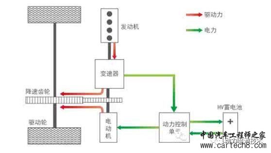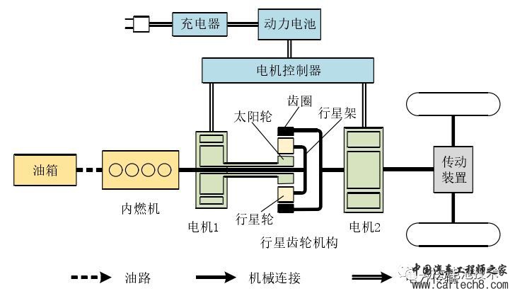 不同于前两类混合动力系统的地方是,混联式混合动力系统具有一个动力分配系统(一般由行星轮组组成),这个动力分配系统将发动机所产生的动能进行分配,可全部作用于汽车驱动轮使车辆行驶,可全部作用于发电机进行对电池的充电,亦可进行精准的能量分配将一部分能量直接作用于车辆行驶,另一部分作用于发电机进行对电池的充电,而电池内电能当然也可驱动电动机带动车辆行驶。而整车PCU(Po以erControlUnit)功率控制单元则可通过调配发电机的工作状态等手段对发动机做功所产生的动力进行一个精准的分派。就是因为混联式混合动力系统这样的特性,即一方面可通过电池与电动机电动方式进行动力传导一一串联式,另一方面又能够使发动机通过机械传导渠道达到动力耦合的目的一一并联式,使此系统同时拥有串联式与并联式的工作状态,故称之为混联式混合动力系统。