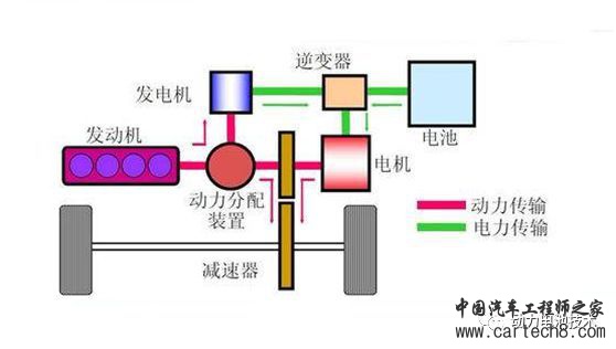 混联式混合动力汽车的主要组成部分分别是由能量分配单元、内燃机、动力电池组、电动机及发电机采用串联式与并联式共存的方式进行组合,混联式混合动力汽车的工作原理及优缺点: