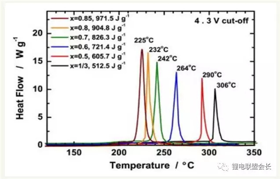 热稳定性:随着三元材料中镍含量的升高,正极材料的热稳定性会随之降低,这个一般用DSC或ARC去测量,温度过高导致正极材料的分解、释氧,引发热失控,所以对于这个指标,实际上是有两层意义,一方面,可以通过包覆、掺杂的方法提高正极材料的热稳定性;另一方面,可以通过控制电池的温度使用范围,去让电池达到一个合理的使用区间;