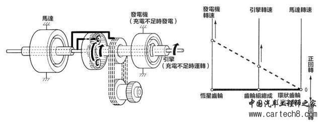 THS II --以行星齿轮为主的动力分配机构结合引擎、马达、发电机,电池电力充足时,仅以马达行驶,电池电力不足时,引擎除了行驶之外还负责运转发电机充电。