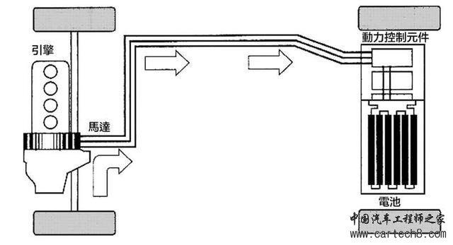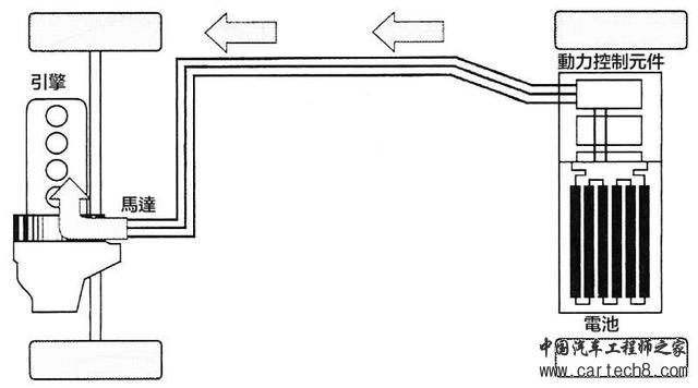 油电混合动力粗分为串联与并联两大类。串联式的引擎不连接传动轴,引擎只是为了带动发电机给电池充电而运转,系统只以马达驱动传动轴;并联式则有引擎─变速箱─传动轴、马达─传动轴这两条连接路径,能够随时切换纯引擎驱动、纯马达驱动、引擎加马达驱动这三种运作模式。