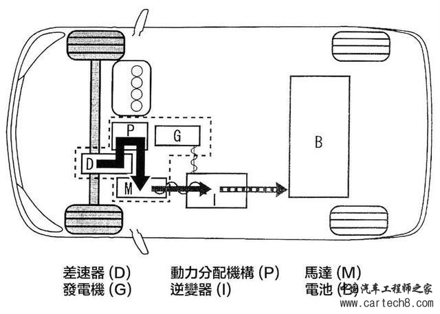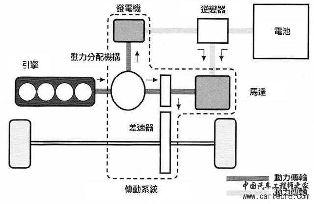 Toyota THS II是以动力分配机构结合汽油引擎、马达、发电机,动力组合的方式有纯引擎、纯马达、引擎加马达,有时引擎只在运转发电机时才会啟动。