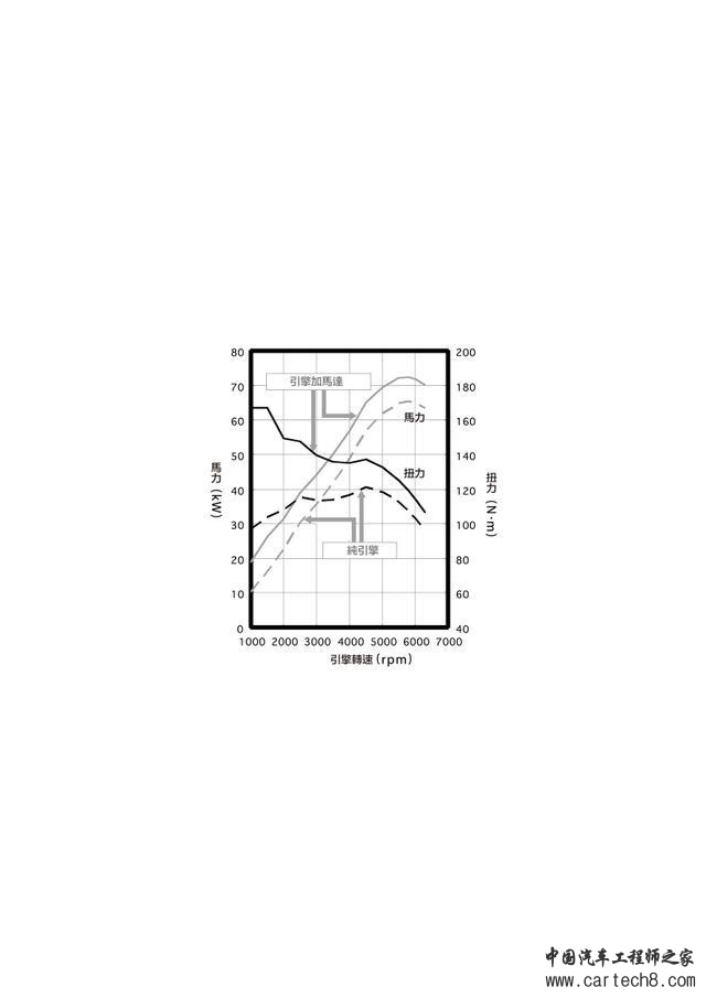 IMA--没有动力分配机构,加速或上坡等高负载时为了弥补引擎动力而增加马达运转,马力曲线平行上昇,而扭力表现也是马达的特色,从低转速域开始就很充沛。