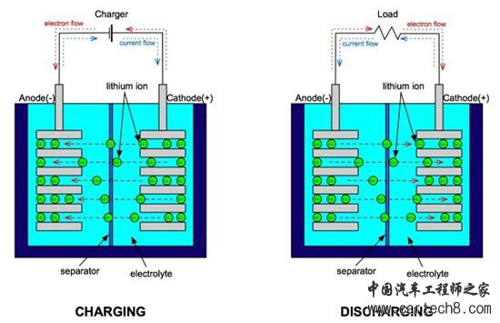 锂离子电池又称作“摇摇椅(rocking chair)”。这是因为在锂离子电池中,锂离子通过电解质在正负极间穿梭。充电时,锂离子从正极材料(如LiCoO2)晶格中脱出,嵌入到负极材料(如石墨)中,使得负极富锂,正极贫锂;放电时,由于负极侧锂的化学势较高,锂离子从负极脱出,插入到正极材料晶格中,从而完成一个循环。其中电解质只是充当传导锂离子的作用。好的电解质需要有高的锂离子电导率,低的电子电导率,还要有较宽的电化学窗口以防止氧化还原反应。