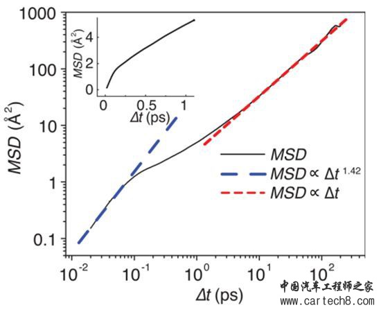 在实际应用中,对上式进行拟合时,需要特别注意起始段和结尾段。Mo等人针对Li7La3Zr2O12, Li10GeP2S12,Li1.33Ti1.67Al0.33(PO4)3材料的计算,提出以下的判据:MSD<0.5a2及?t>0.7ttot的数据舍去。其中a为锂原子位间距,ttot为总的MD时长。