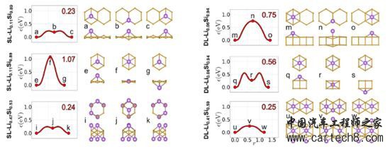 NEB可以用来计算过渡态(Transition state),也可以用来计算锂离子在体系中的扩散。以层状Si为例,锂离子在其表面的扩散可以有以下几种方式,分别对应单层(SL)Si和双层(DL)Si结构。扩散能磊越小,意味着锂离子越容易扩散。可以看出不同的扩散方式以及不同浓度下锂离子的扩散能磊各有不同。在实际计算中,通常先优化初始和末态的结构,然后利用vtst的脚本对中间结构进行差值。提醒读者需要在插完值后对中间结构进行检查。