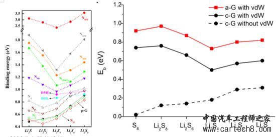 在实际计算中,考虑到S原子和C原子之间比较强的范德华作用力,一般需要在DFT的计算基础上引入范德华修正。Zhang等研究了考虑范德华修正和不考虑范德华修正下多硫化锂和石墨烯的作用,发现引入范德华修正后吸附能会提高,而且趋势也有所变化。在不考虑范德华修正的情况下,多硫化合物和石墨烯几乎没有作用,吸附能在0.1~0.3 eV。在vasp中,考虑范德华修正的相关参数为IVDW。