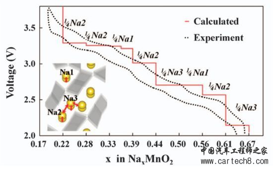 因此,只要计算出脱出锂离子前后体系的能量,就可以计算出充电工作平台。当然,上式也可以用来计算钠离子电池的电压平台。如Ceder课题组就针对NaxMnO2做了计算并和实验数据比较。可以看到计算结果与很好地与实验放电平台匹配。
