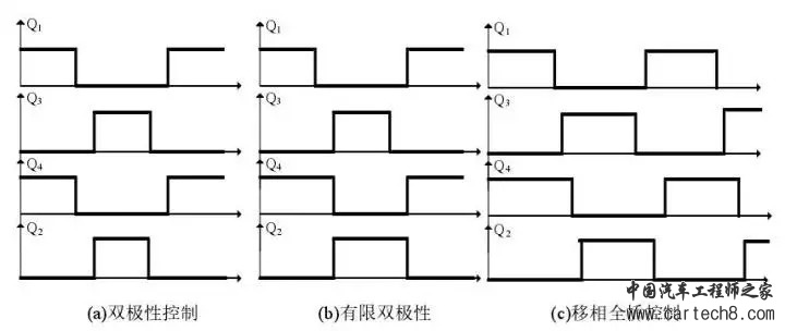 Q1 和 Q3 为超前桥臂上的开关管,属于同一桥臂,而 Q1 和 Q4 为对角的开关管,分别属于两个桥臂。第一种控制方式为硬开关,第二和第三种均可以实现软开关,但是第三种的控制方式较灵活,比较容易实现。