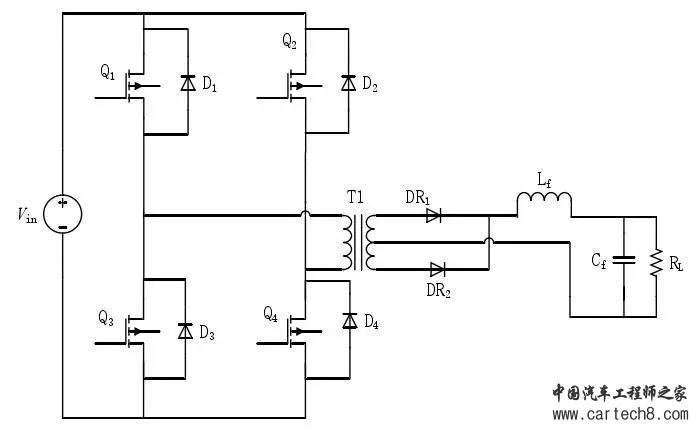 又叫做功率模块,是整个DCDC的主体。一个典型的全桥型 DCDC 变换器主电路拓扑如下图所示。