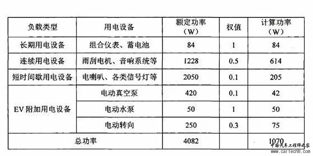 根据纯电动汽车车载电子设备的不同属性,能把用电设备分为长期用电、连续用电、短时间间歇用电和附加用电设备种类型,并赋于不同的权值。其中,长期用电设备包括组合仪表和蓄电池,权值取1;连续用电设备包括雨刮、电机、音响系统和仪表照明等设备,权值可取0.5;短时间间歇用电设备包括电喇机、各类信号灯、控制器等设备,权值可取0.1;附加用电设备电动真空泵、电动水泵和电动转向,权值根据实际情况分别取0.1、1、0.3。各类设备所消耗功率分析如表所示。