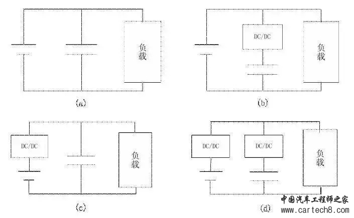 与超级电容配合使用的DCDC,在整车电源中的位置如下图所示,它可能出现在图(b)、(c)、(d)中所示位置上,而(b)是应用较多的一种形式。