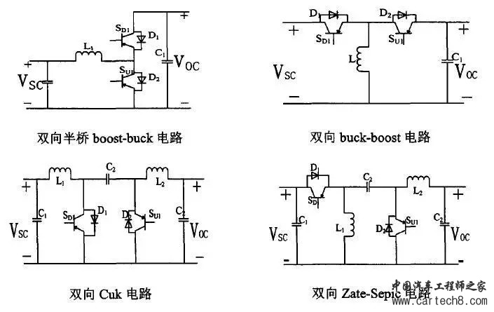 非隔离双向DCDC,结构比较简单,每个部件都是直接相连,没有额外的能量损失,工作效率比较髙。对升压侧的电容要求比较高。主要的非隔离DCDC电路结构有双向半桥boost-buck电路,双向buck-boost电路,双向buck电路,双向Zate-Sepic电路,如下图所示。
