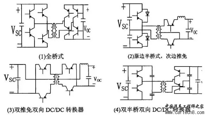 隔离型双向DCDC,在非隔离型双向DCDC转换器的基础上加上一个高频变压器就构成了隔离型双向DCDC转换器,高频变压器两侧的电路拓扑可以是全桥式、半桥式、推挽式等等。这几种隔离型的双向DCDC转换器,采用了更多的功率开关,电压变比大,带电气隔离等优点。但是这类DCDC转换器结构复杂,成本也相对较高,转换器的损耗高,低频时会导致隔离变压器铁芯饱和,损耗会进一步增加。因此,非隔离型双向DCDC转换器比隔离型在电动汽车上运用更具有优势。