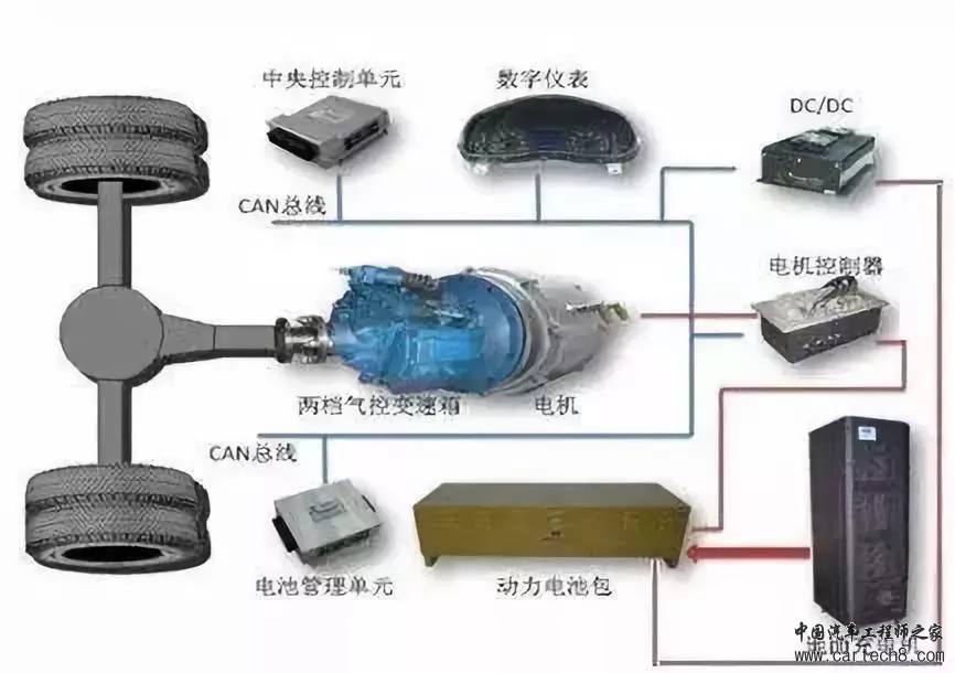 给车载电气供电,DCDC在电动汽车电气系统中的位置,如下图所示。它的电能来自于动力电池包,去处是给车载用电器供电。