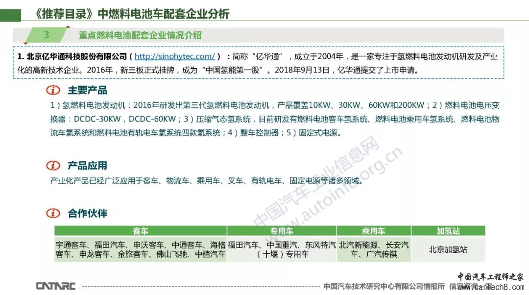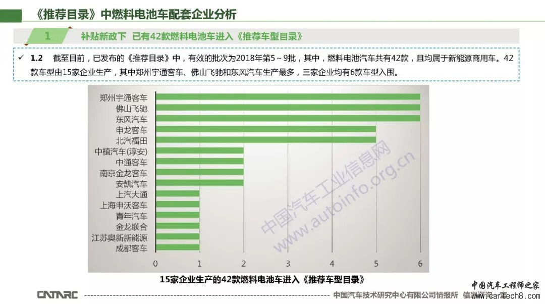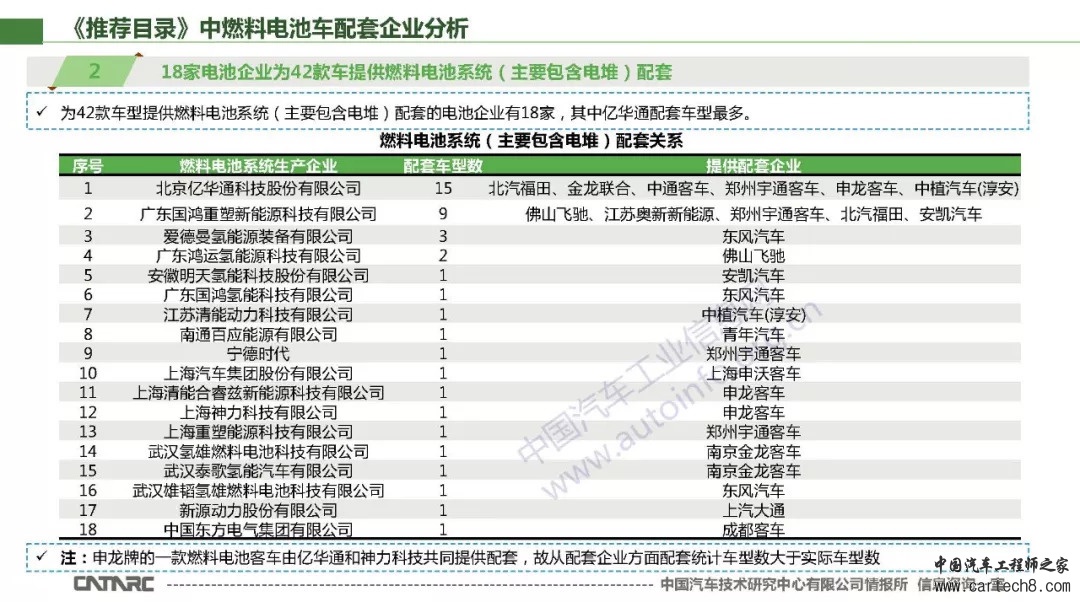 9月6日,工信部发布2018年第9批《新能源汽车推广应用推荐车型目录》。截至目前,已发布的《推荐目录》中,有效的批次为2018年第5~9批。其中,燃料电池汽车共有42款,提供燃料电池系统(主要包含电堆)配套的电池企业有18家,其中亿华通配套车型最多。