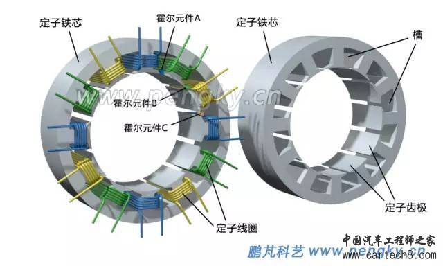 霍尔元件安装在定子两个齿极间的空隙处,当转子的两个磁极交界处通过霍尔元件时,霍尔元件检测到极性变化,发出信号控制驱动电路进行三相电流的切换,共有霍尔元件A、霍尔元件B、霍尔元件C三个霍尔元件,见图1、图3、图6。