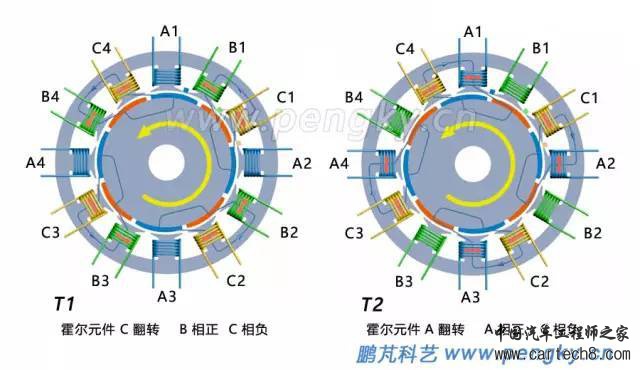 在进入T1时刻,霍尔元件C检测到转子磁极由S变为N,驱动电源输出为B相正、C相负,两相线圈产生的磁场吸引转子旋转,见图7左图。