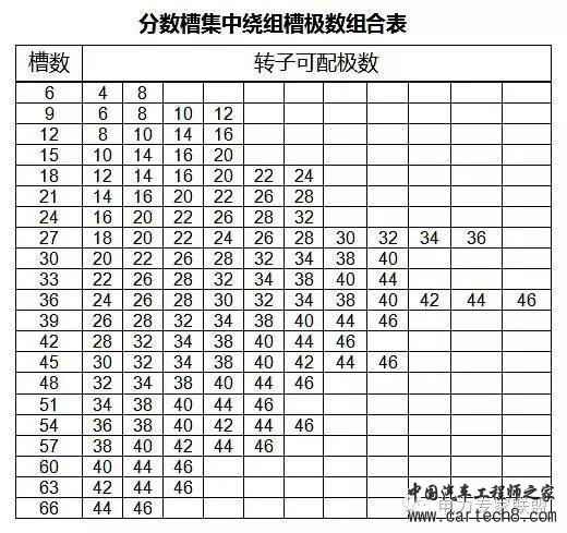 分数槽集中绕组永磁电机的定子槽数与转子磁极数可以有多种组合,在下表在列出了各种定子槽数可采用的转子磁极数。