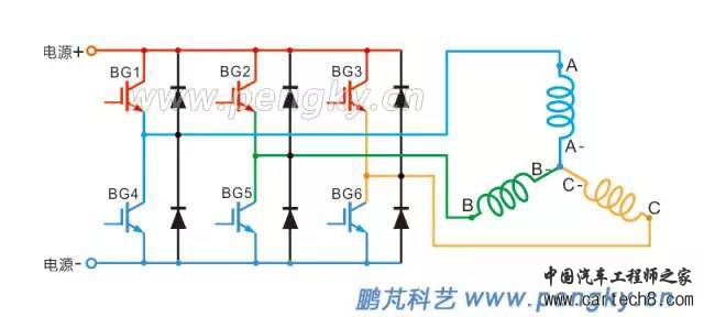 电机的驱动电源由三相桥式电路组成,图5是连接示意图。与三相逆步电动机或三相同步电动机不同,该永磁电机输入的不是正弦波,在每时刻仅有两相通电。