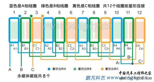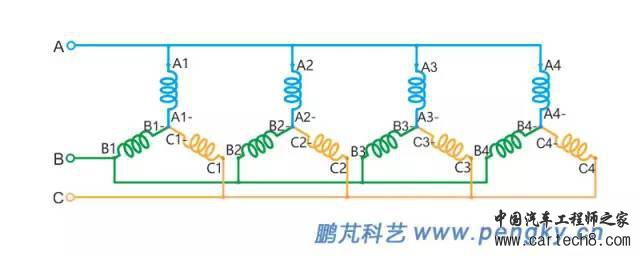 在图2中,4个蓝色线圈串联组成A相绕组;4个绿色线圈串联组成B相绕组;4个黄色线圈串联组成C相绕组。各相绕组的线圈连接见图3,12个线圈组成三相绕组,三相的末端连接起来构成星形接法。