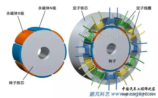 为显示清晰在原理介绍时采用单层线圈表示,图1左图是绕有线圈的定子。显然,集中绕组的线圈端部长度短,铜损小,效率就高;绕组无重叠,相间绝缘好;线圈易机械下线,降低生产成本。