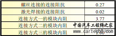 测试方法,单独测试螺丝连接和激光焊接的连接阻抗,各取一块短连接排与一节锂电池分别做螺丝连接和激光焊接实验,测量记录下各自的连接阻抗。同时通过测量锂电池模块正负极两端来得到整个模块的内阻值,从而比较不同连接方式下锂电池模块的内阻差异。连接阻抗和内阻均采用HIOKI 电池测试仪测量获得。