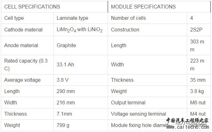 Leaf 电池小模组,每个壳体内放置4只电芯;小模组与小模组之间依靠注塑连接件连接。每个模组极柱的接线端,根据每个模组的数量,专门注塑定制了相应的接线盒,每个接线盒的形式与模组是一一对应的。如果模组内电芯(2p2s)数量改变,其接线盒就不能使用,除非数量是已有模组的整倍数,而且并列模组数一致。例如,如果一个模组是4×2(个电芯)的,那么改动后的模组就必须是8×2、12×2……,否则其原有电极接线盒就无法使用。