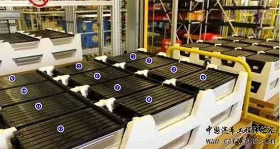 雷诺ZOE,2016年9月雷诺对ZOE电池包进行了升级,新款电池包总电量为45.6kWh,可用电量为41kWh,系统额定电压360V,系统成组方式为2P96S,共192个电芯,由12个2P8S模组组成。ZOE电池包采用风冷热管理方案,由中间的孔进,两侧的孔出。