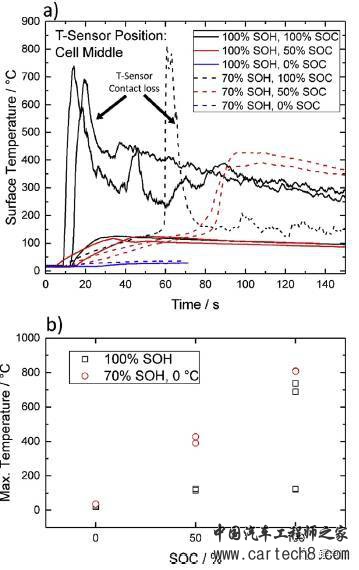 为了确认电池老化对电池短路实验的影响,进行了针刺实验。实验结果如下图所示:
