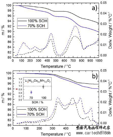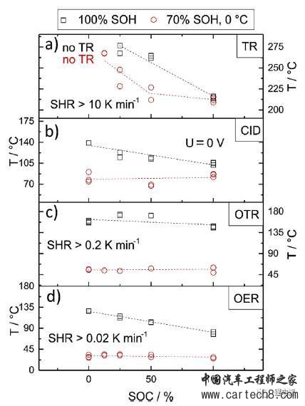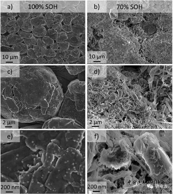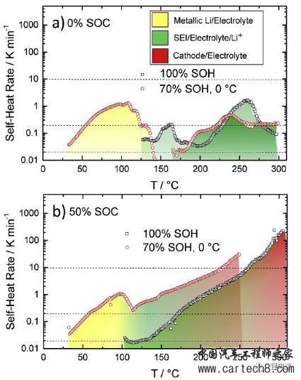 未低温循环的电池初始放热反应(OER)开始于90℃附近,成直线增长至125℃,并伴随着SOC的降低,说明OER极度依赖于负极中锂离子的状态。对放电过程电池来说,分解反应中最高的SHR(自加热速率)是在160℃左右产生的,在高温下SHR会降低,因此确定了插层锂离子的消耗在负极。