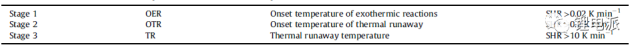 在准绝热条件呵和HWS模式下,对未低温循环的电池和低温循环的电池进行ARC(加速量热计)测试,从ARC-HWS结果来看,放热反应是由电池内部引起的,而跟外部环境温度无关,电池内部的反应可以分为三个阶段,如表1所示。