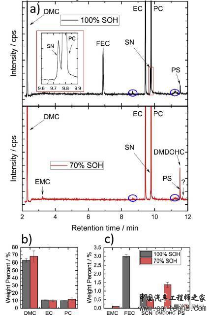 电池循环后电解液的主要产物是DMDOHC,其合成是与SEI的形成相一致的。因此图4a中大量的DMDOHC意味着大面积SEI的形成。
