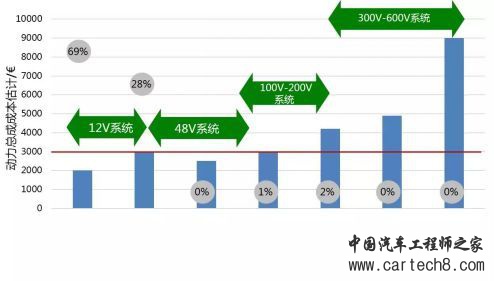 12V电压系统在引入启停机构之后,基本已经达到了功率输出极限,如果在12V电压下引入轻混系统,功率需求在10kW~15kW左右,这样的电压下电池的输出电流高达1000A,显然行不通。