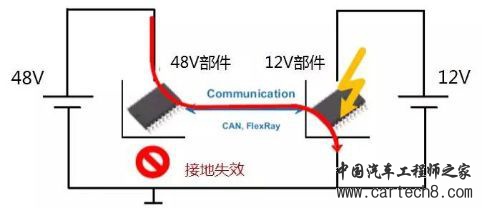 双电压系统中,高压模块接地失效后,电流直接通过低压模块与地面接触,会对低压模块部件造成损坏。