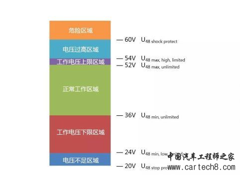 由奥迪、宝马、戴姆勒、保时捷和大众物价德国厂商与2011年制定的LV148标准中,电子元件正常工作电压为36V-52V,高于60V的电压被严格禁止,为了达到这一限值标准,设定了54V和52V电压限制,以留出电压波动区域。