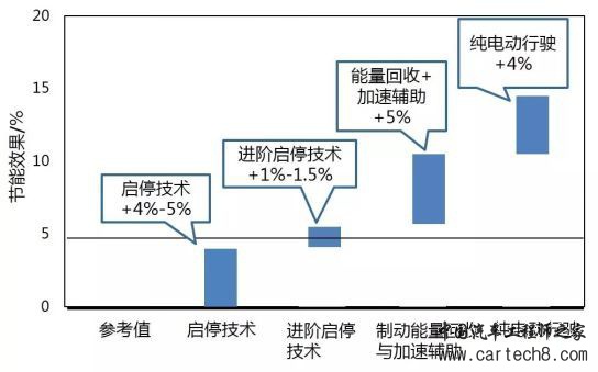 通过使用48V电压平台以及对全车用电设备的改进,同时配合发动机启停、制动能量回收、低滚阻风阻等技术,可以使搭载绿混技术的车辆实现百公里节油1.5升左右。