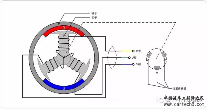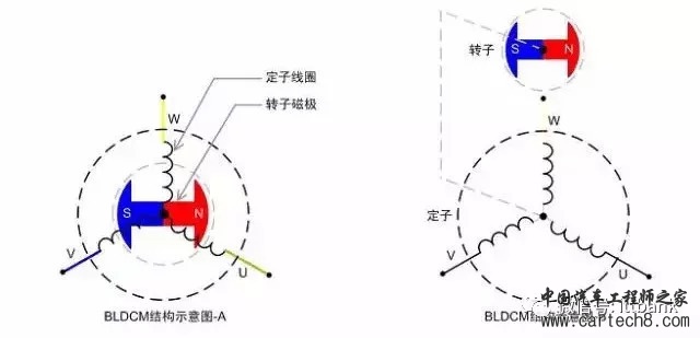 无刷直流电机的定子是线圈绕组电枢,转子是永磁体。如果只给电机通以固定的直流电流,则电机只能产生不变的磁场,电机不能转动起来,只有实时检测电机转子的位置,再根据转子的位置给电机的不同相通以对应的电流,使定子产生方向均匀变化的旋转磁场,电机才可以跟着磁场转动起来。