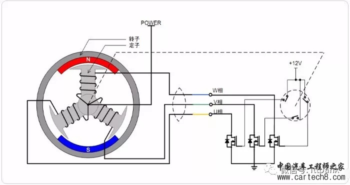 如图2所示为无刷直流电机的转动原理示意图,为了方便描述,电机定子的线圈中心抽头接电机电源 POWER,各相的端点接功率管,位置传感器导通时使功率管的 G极接 12V,功率管导通,对应的相线圈被通电。由于三个位置传感器随着转子的转动,会依次导通,使得对应的相线圈也依次通电,从而定子产生的磁场方向也不断地变化,电机转子也跟着转动起来,这就是无刷直流电机的基本转动原理——检测转子的位置,依次给各相通电,使定子产生的磁场的方向连续均匀地变化。