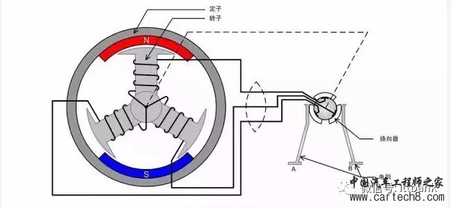 电机主要由永磁材料制造的定子、绕有线圈绕组的转子(电枢) 、换向器和电刷等构成。只要在电刷的A和B两端通入一定的直流电流, 电机的换向器就会自动改变电机转子的磁场方向,这样,直流电机的转子就会持续运转下去。