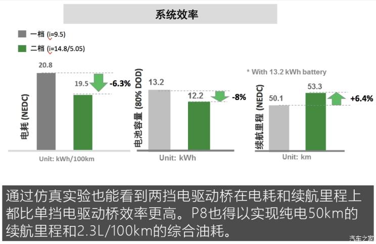那么问题又来了,既然这样,搭载在P8后桥上的电驱动桥配备两挡减速器岂不是多此一举?其实并不是这样,两挡减速器能够让原本“笨重”的插电混合动力SUV变得“轻快”,加速性能更强、系统的效率更高、整车的NVH更优秀,下面我们就具体聊一聊。