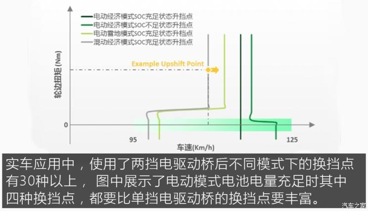 混合动力车型模式较多,使用单挡电驱动桥,电驱动桥能够给予车辆的帮助比较单一,但是使用两挡电驱动桥,则可以调整不同工况下的换挡曲线,随着动力模式、驾驶模式和电池状态改变调整换挡点来实现整车的控制目标。