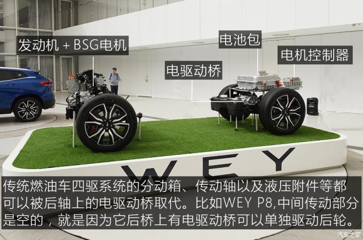 采用后桥电驱动实现四驱可以节约大量的空间和重量,给电池包腾出地方,另外还节约掉了分动箱、传动轴的成本。目前这种在后桥上放置电驱动桥的方法被广泛地应用在插电混合动力SUV上,比如比亚迪唐100采用的是P034构架、长安CS75 PHEV采用的是P134构架,长城WEY P8则采用P04构架。