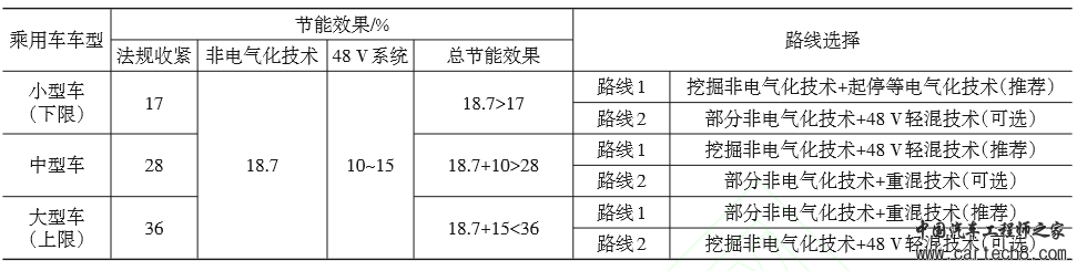 接下来结合未来法规发展趋势,讨论48V系统未来的应用空间。实际上,汽车产品总会搭载大量节能技术以达到法规和市场要求,因此,本文在分析中也考虑了其他节能技术的影响。