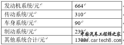 其他包括发动机系统、传动系统、车身系统、制动系统等的成本变化,这些多为机械结构变化,不涉及电气部件,因此可直接取36V车辆拆解的结果,合计约为1303元,如表6所示。