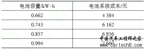 电力供给系统是48V系统最大的成本增长点。一般48V轻混系统需要搭载支持电机持续运行0.02小时左右的电量,因此,电池容量需求约为0.3-0.4kWh。表5[22]列出了不同电池容量的成本数据,以此为基准进行拟合曲线折算,以电池容量0.35kWh计算,可推定48V系统电力供给系统的成本增量约为2480元。