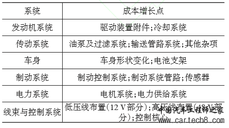 成本方面可采用常用的相关成本增量法进行估算,即先分析新技术改变了车辆的哪些系统,确定成本增长点,再考虑各增长点发生的成本变化,获得总体的技术应用成本。